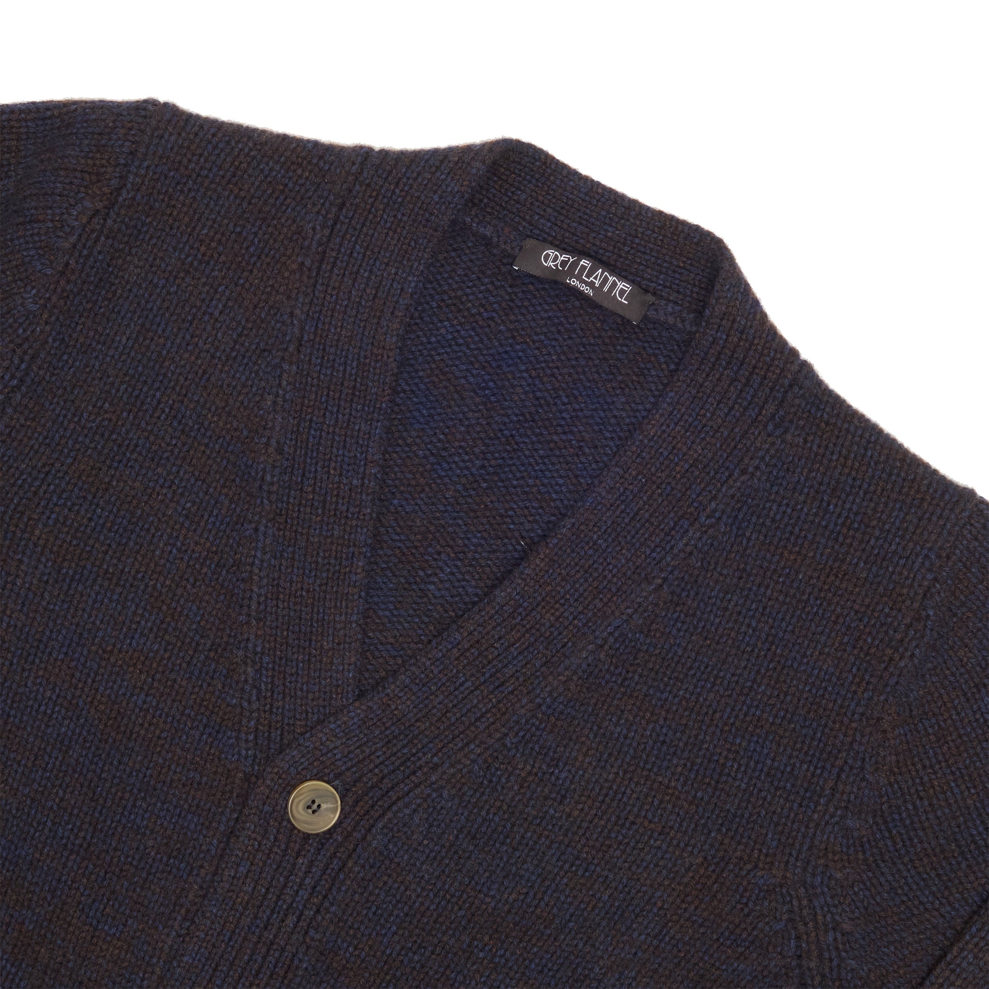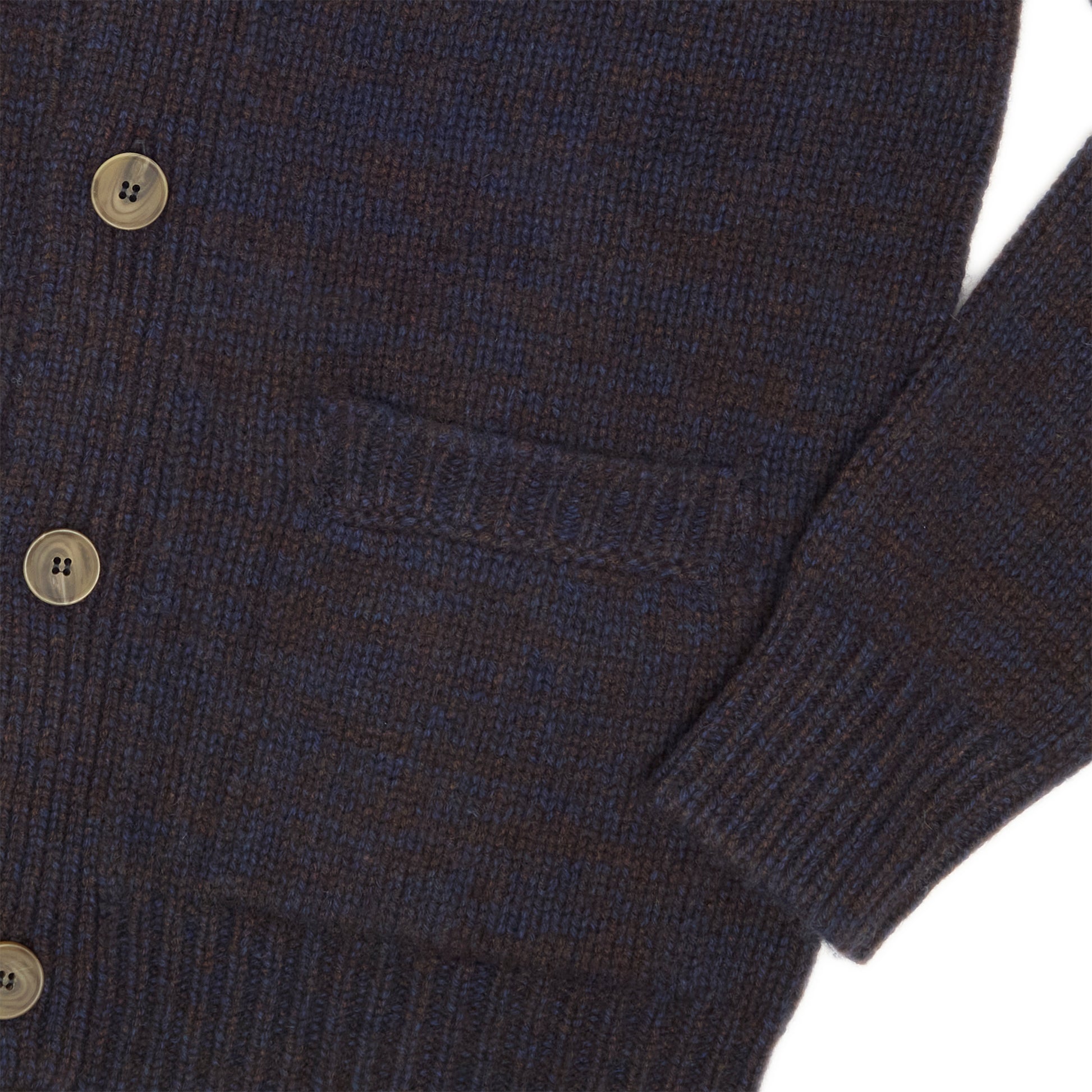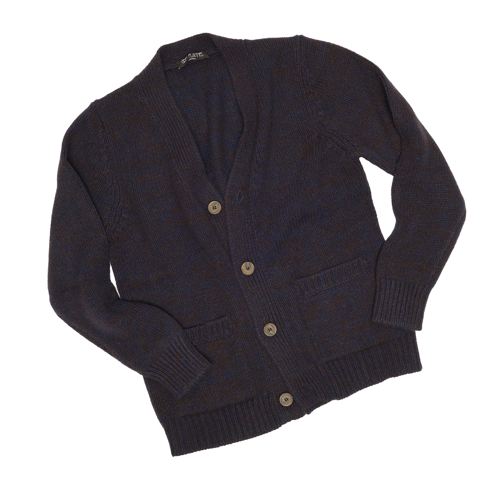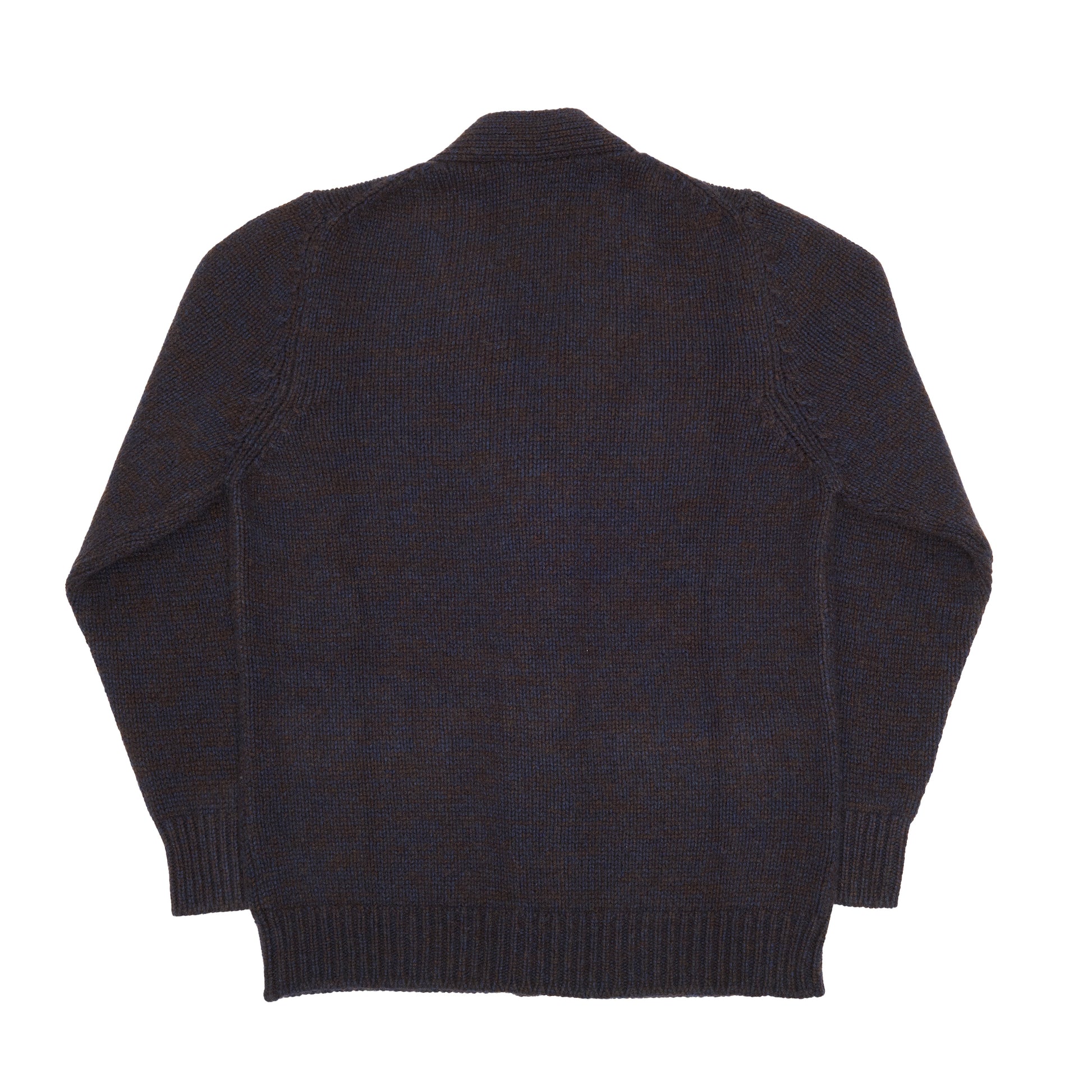 The deep navy base is subtly interwoven with brown yarn, creating a sophisticated marled effect that adds texture and depth without overwhelming the eye. A wide, gently structured cardigan lapel frames the neckline, adding a relaxed yet tailored silhouette ideal for layering.