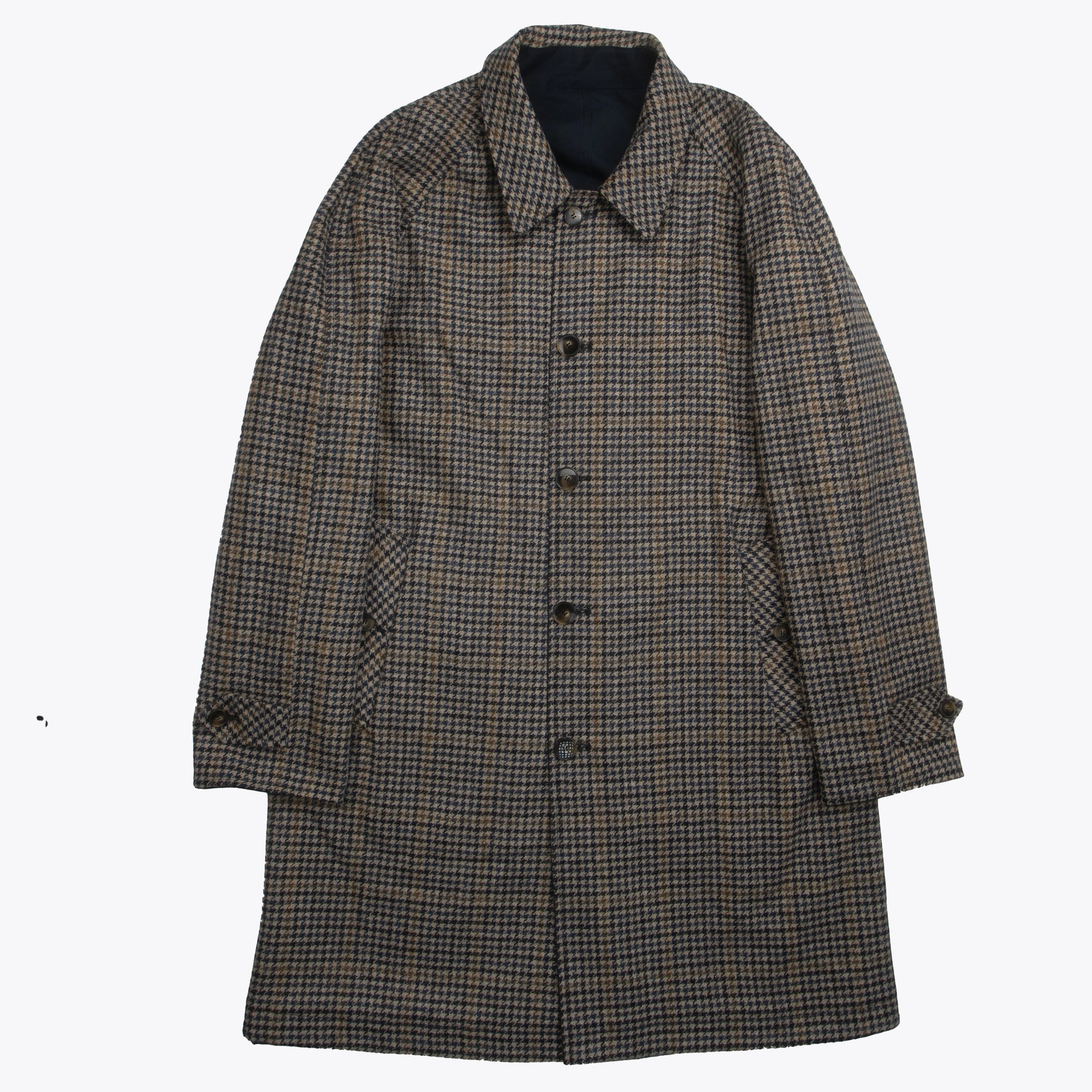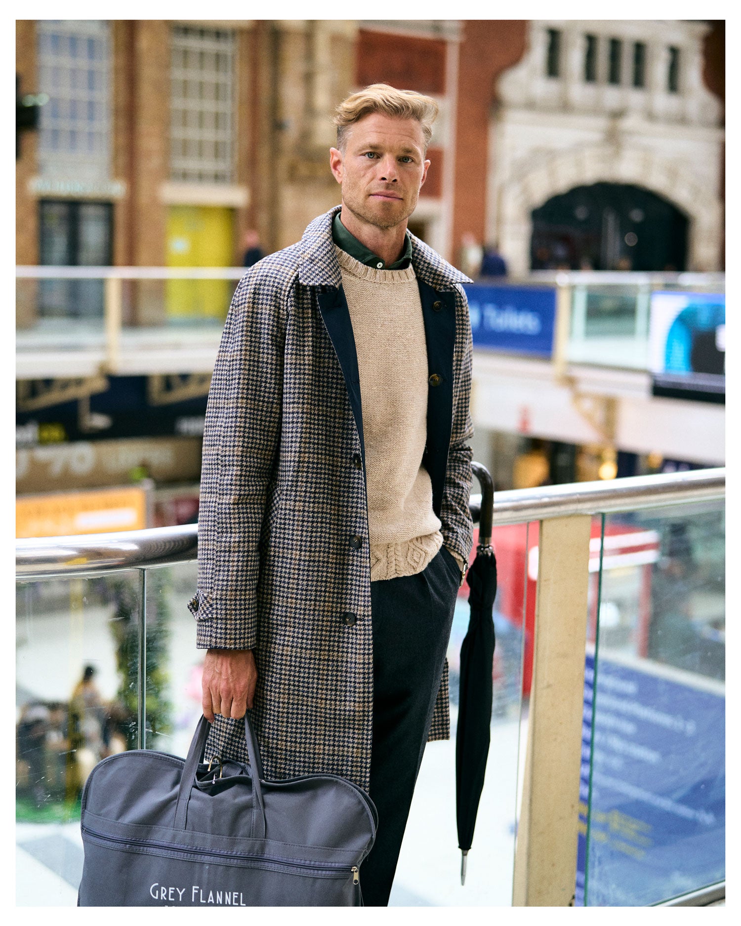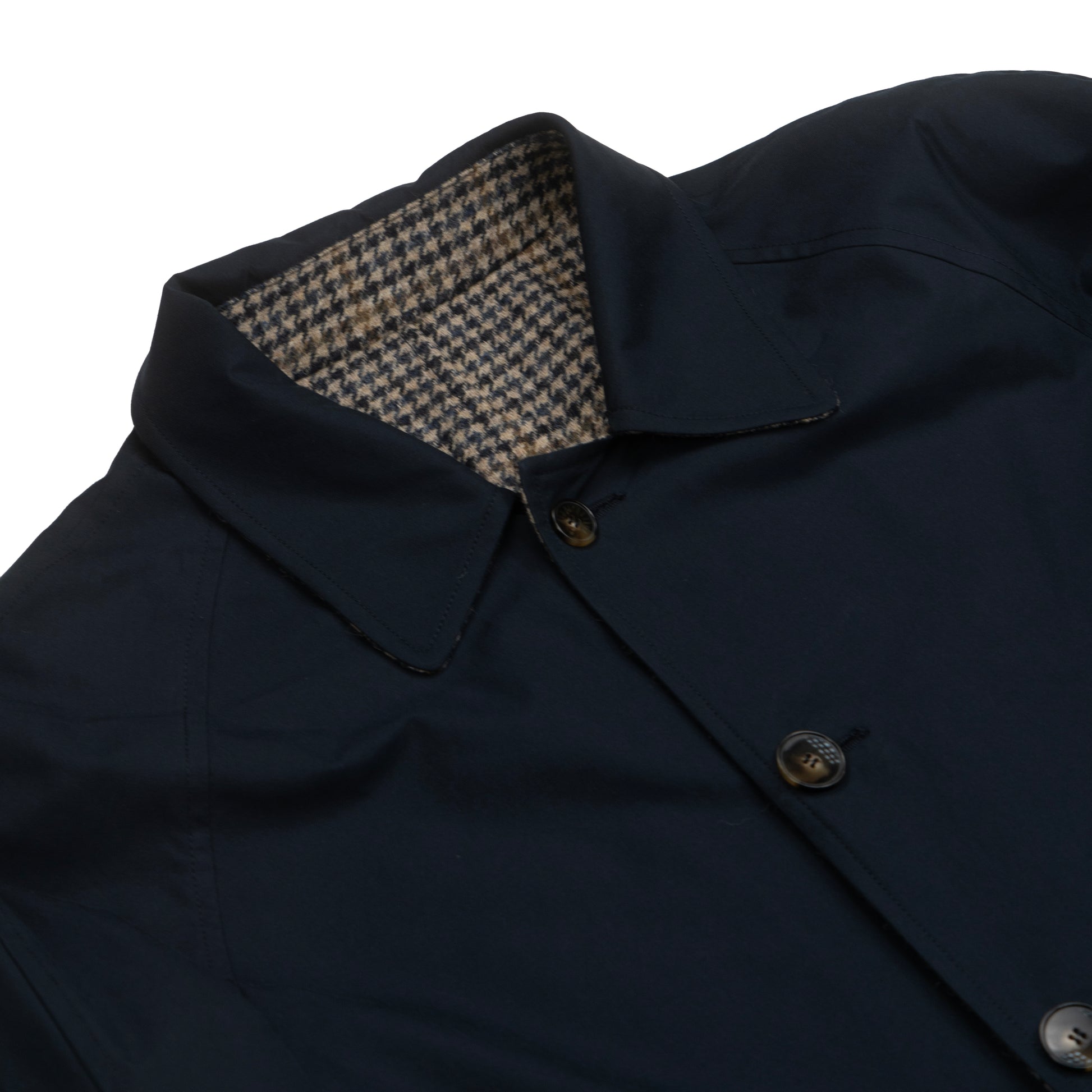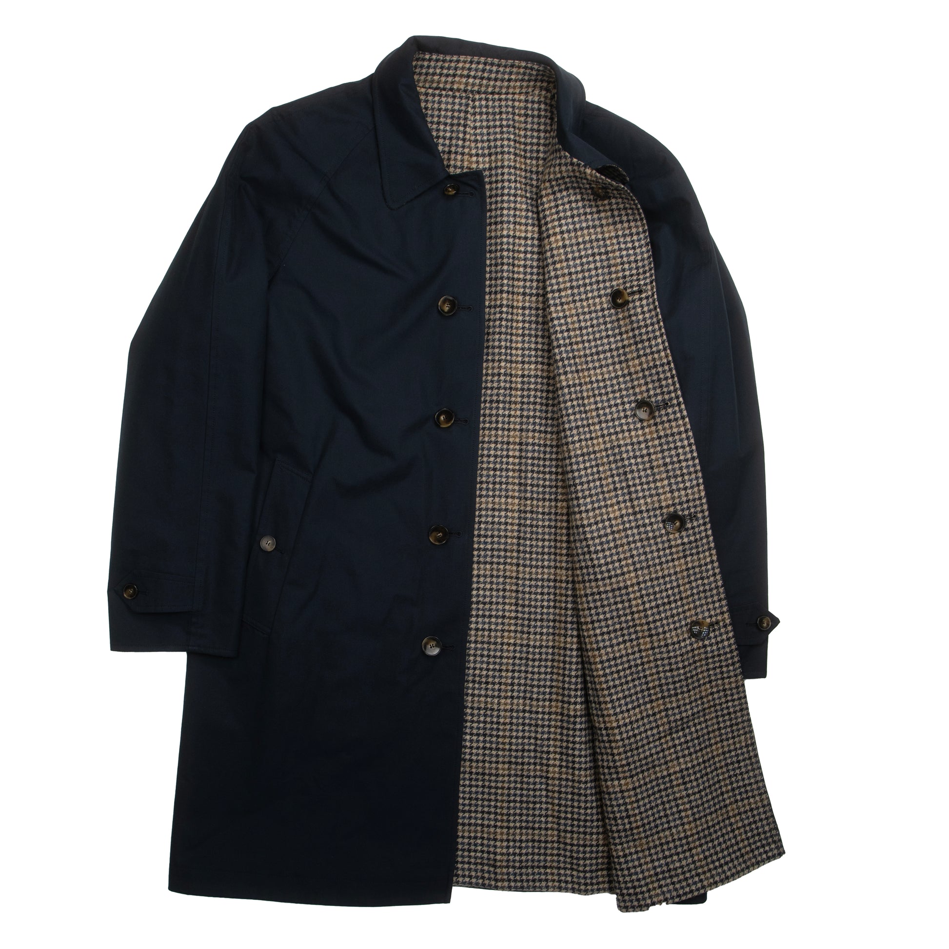 With this piece you get two coats in one, the raglan overcoat can be worn with either the wool dogstooth pattern as the outer for a classic yet contrasting look or reversed to the water repellent cotton gabardine in a Navy colourway for a look that isn't just stylish but goes under the radar when about town.