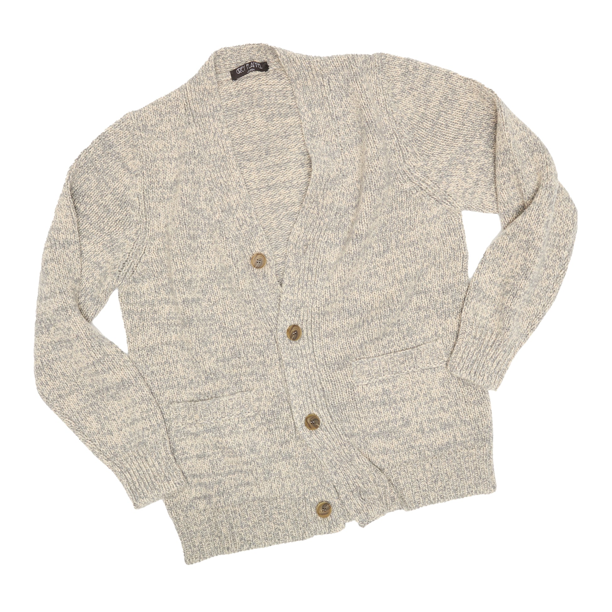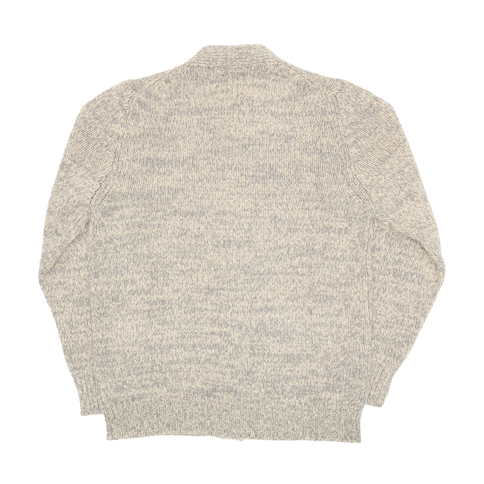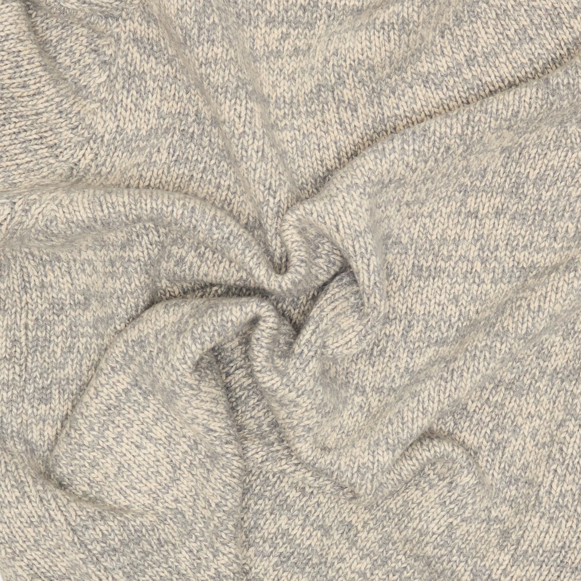 The grey base is subtly interwoven with beige yarn, creating a sophisticated marled effect that adds texture and depth without overwhelming the eye. A wide, gently structured cardigan lapel frames the neckline, adding a relaxed yet tailored silhouette ideal for layering.